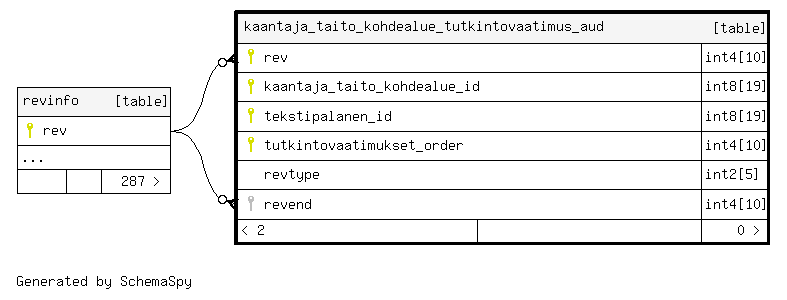 | kaantaja_taito_kohdealue_tutkintovaatimus_aud_pkey | Primary key | Asc/Asc/Asc/Asc | rev + kaantaja_taito_kohdealue_id + tekstipalanen_id + tutkintovaatimukset_order |